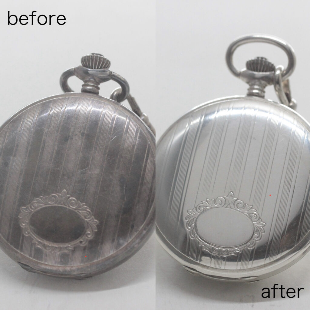 年々高騰が続く銀無垢。よく「いぶし銀」とは聞くものの、どんなに変化していくのか?画像は左側が長年使用されたもので、右側はその時計を色戻しをしたもの。必ずエイジングするわけではありませんが、所有する人のライフスタイルによっ