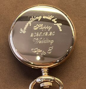 刻印前レイアウトを何度かご覧いただき、文字の内容も途中で変更するなどこだわりの刻印に仕上がっております。新婦さんに喜んで頂けていたら嬉しいです。