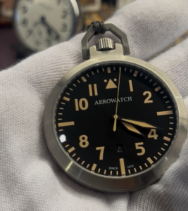 こちらのアエロ懐中時計は、クラッシックな物とは違いモダンなミリタリーデザインになっています。蓄光で夜間の視認性もばっちりです。かっこいいですね!