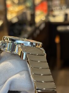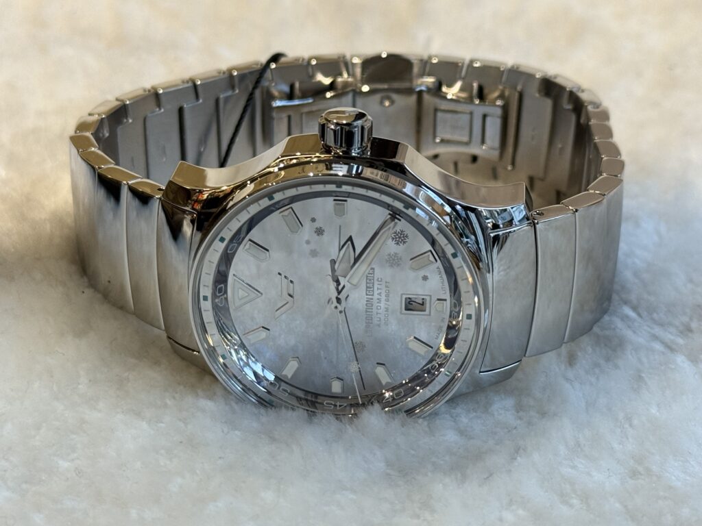 朝焼けの氷河の輝きをイメージした全面鏡面仕上げの腕時計。文字盤からベゼル、ベルトに至るまですべてが鏡面となっており、時計全体に風景を映し出す模様は、まさに氷河のような透明感!まさにミラーウォッチ!