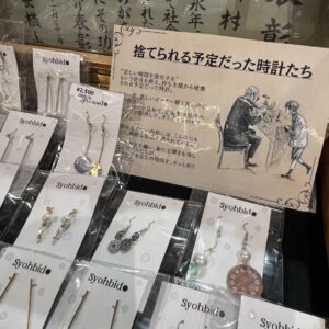 動かなくなってしまった時計や捨ててしまう部品をアクセサリーに生まれ変わらせています。